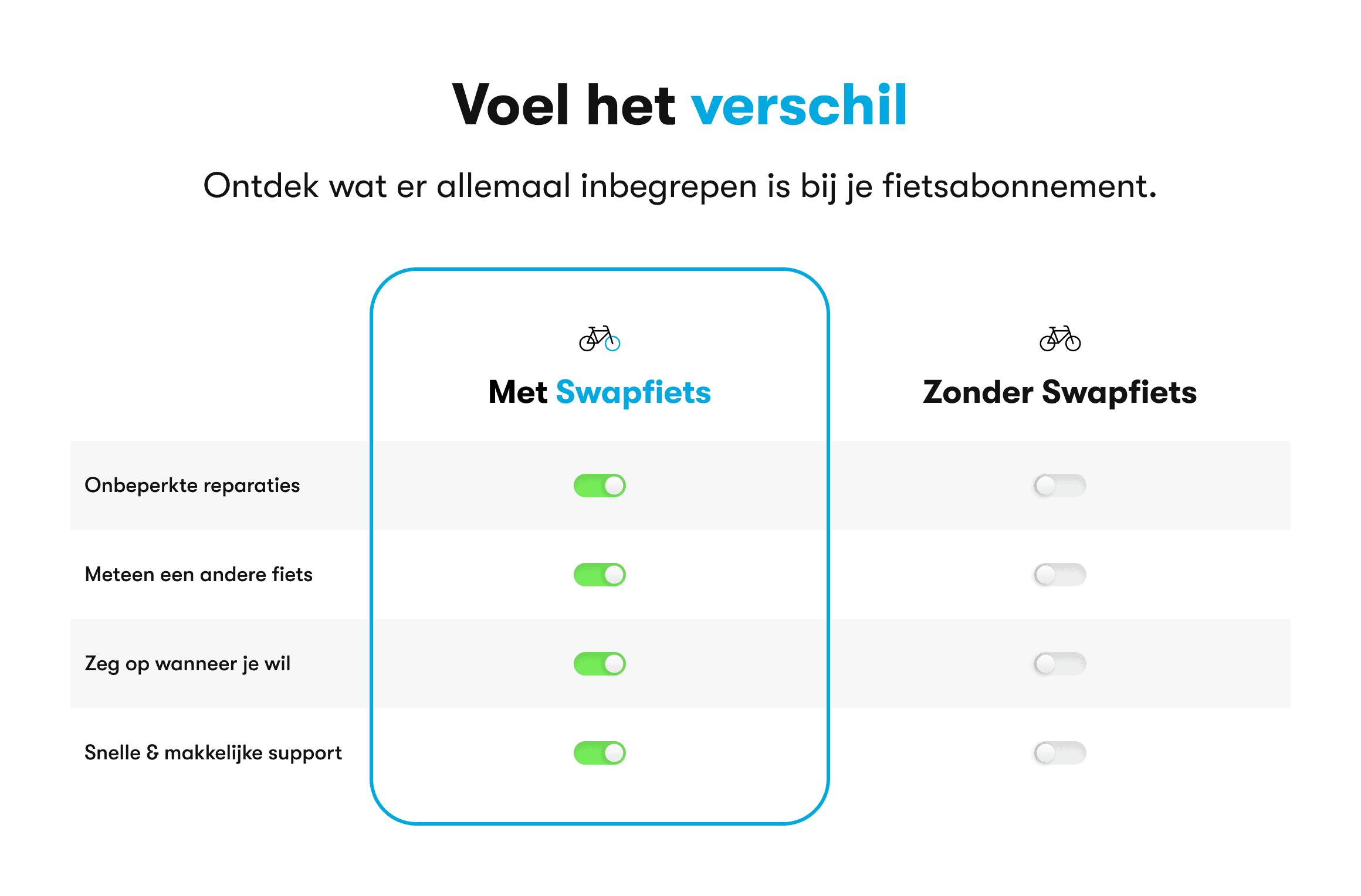 We volgen al jaren de meest voorkomende fietsproblemen: roestige kettingen, onverwachte lekke banden en diefstalstress. Precies daarom bestaat Swapfiets: om het gedoe van een eigen fiets voorgoed op te lossen.